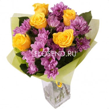 Букет из роз и хризантем и зелени